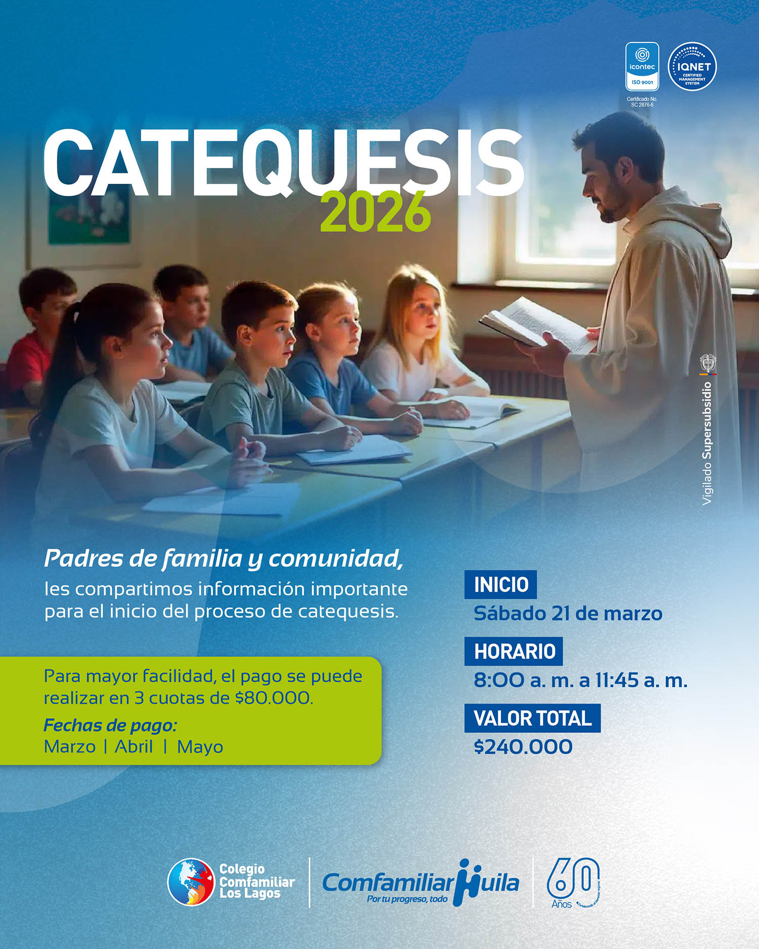 El Colegio Comfamiliar Los Lagos informa a los padres de familia y a la comunidad educativa el inicio del proceso de catequesis 2026, un espacio formativo orientado al fortalecimiento de valores, la espiritualidad y el crecimiento integral de los estudiantes.